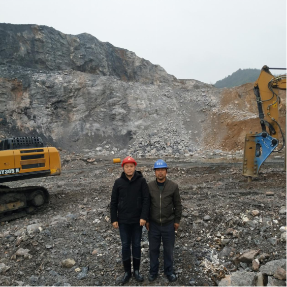 采礦:液壓破碎錘沖擊破巖→挖掘機裝車→自卸汽車運送至破碎口或堆場。