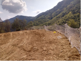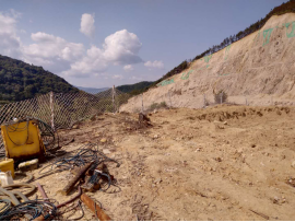 礦山將原1號采場+460m凹陷采坑一邊作為排土場,該凹陷采坑邊坡均為花崗巖體,較為穩(wěn)固,排土場的選址滿足需求。實際礦山在凹陷坑中間建一座毛石漿砌擋墻(擋墻長40m,高約3m,壩頂寬約1.5m,內(nèi)外坡比約為1∶0.3),排土場有效堆排面積約3800m2,堆置高度約5m,排土場有效庫容量為1.9萬m³,目前現(xiàn)有排土場內(nèi)已堆排的廢石土量約0.5萬m³。 |